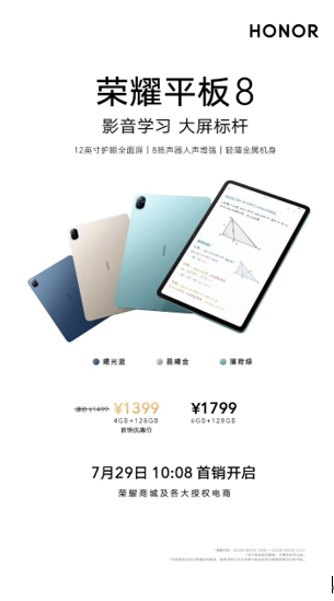 7月29日,荣耀平板8正式开售。作为一款主打K12教育及影音娱乐场景的平板新品,荣耀平板8搭载业界首款12英寸护眼大屏、档位唯一立体声8扬声器及一体化金属机身,内置海量优质教育资源,全面满足青少年儿童进阶教育和家庭娱乐需求。首销期间,4GB+128GB限时优惠立减100元,到手只需1399元,高质价比刷新同级产品天花板,打造“3000元以下最好用学霸级平板”。
