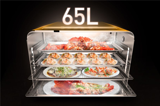 这款金帝集成灶月兔二号G901ZK集成65L大容量蒸烤箱,里面是多功能多层空间组合,这里我们就可以高效利用,当亲朋好友来家里聚餐,无论是蒸烤好的美食,还是炒好的菜肴,都可以摆放在里面,无需设计加长台面。