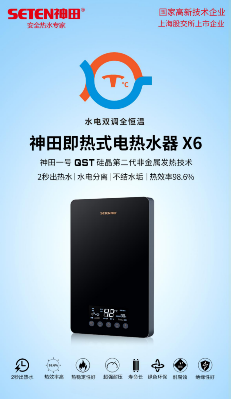 2021年12月,神田推出新品X6,这款高端产品最引人关注的就是采用了水电双调全恒温技术与神田一号QST硅晶第二代非金属发热技术。