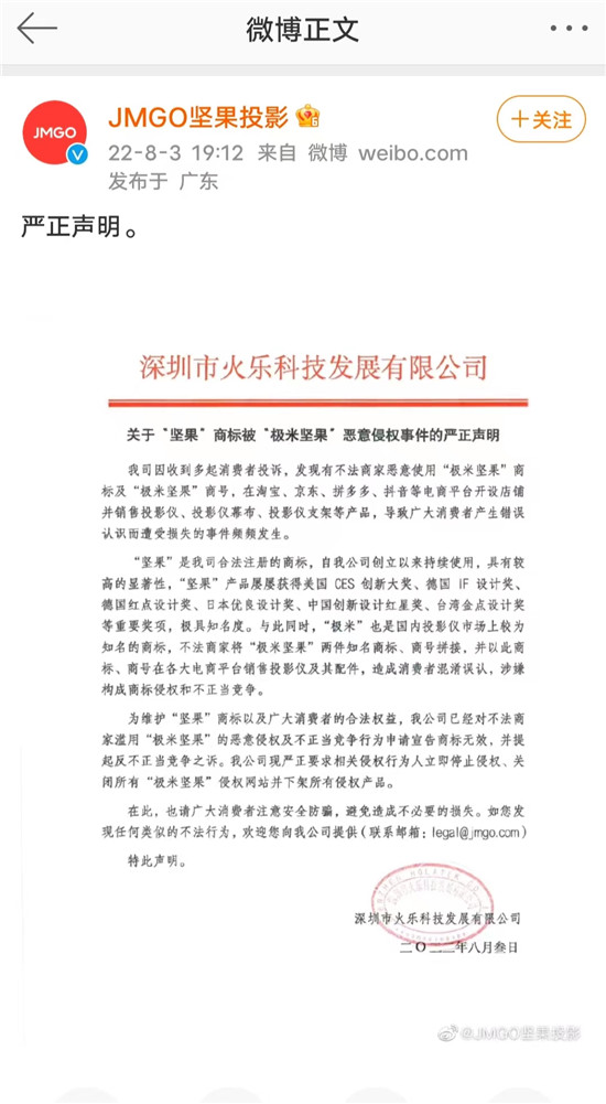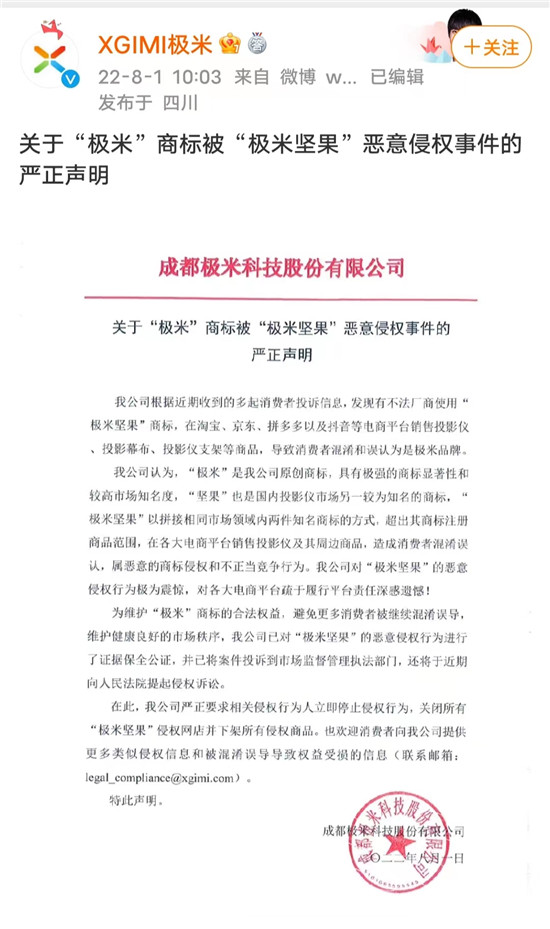 在8月1日,极米在官方微博上发布:关于“极米”上边被“极米坚果”恶意侵权事件的严正声明。