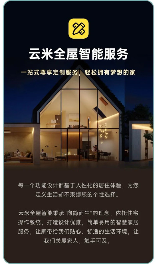 云米科技自创立以来,就十分注重打造和提升客户服务体验,并不断完善数字化服务体系和全流程客户服务解决方案。2021年4月,基于为云米用户提供人性化的居住体验的理念,云米推出云米全屋智能服务方案。用户使用云米全屋智能服务,不只是智能产品和场景体验,还将享受到全屋智能方案设计、设备OTA升级、PLUS会员、耗材管理、清洁保养、延保售后等多种服务。