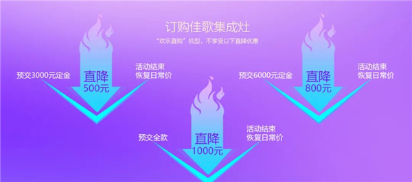 订购佳歌集成灶,预交全款即可享受直降1000元大牌价到优惠。