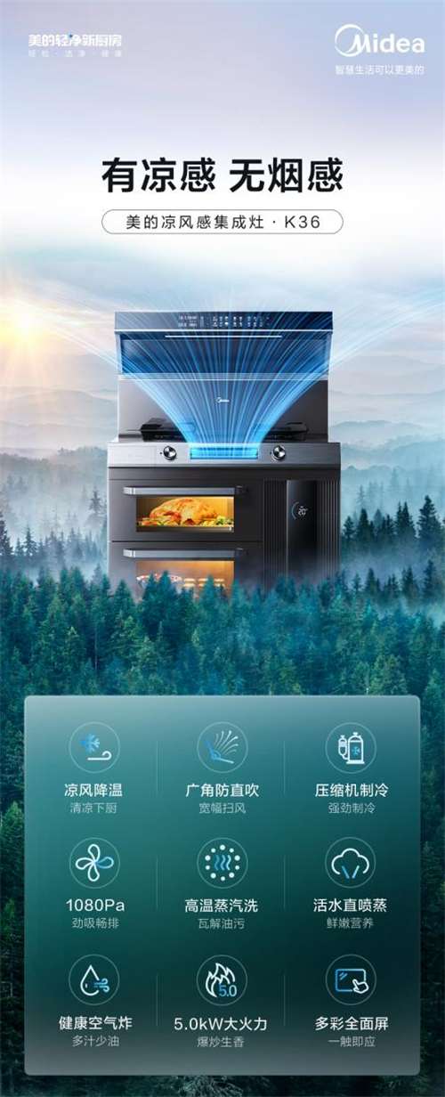 除此之外,美的凉风感集成灶K36还集高温蒸汽洗技术、上蒸下烤技术、5.0kW大火力、多彩全面屏设计等优势于一身,为夏日厨房增添些许惬意。
