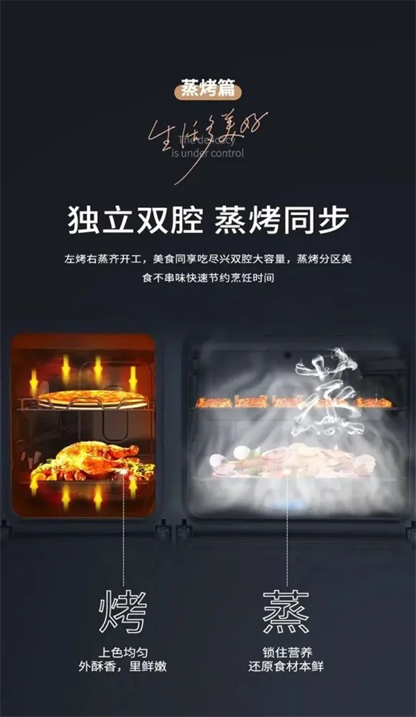 每到聚会,要蒸海鲜,又想烤鸡翅,但是传统蒸烤一体只能执行单一“任务”,蒸和烤不能同步进行。如何能实现蒸烤同步,节省时间更高效呢?
