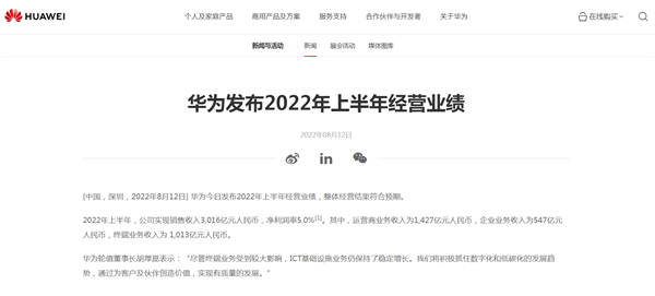 2022年上半年,公司实现销售收入3,016亿元人民币,净利润率5.0%(披露财务数据基于国际财务报告准则,未经审计。)。其中,运营商业务收入为1,427亿元人民币,企业业务收入为547亿元人民币,终端业务收入为1,013亿元人民币。