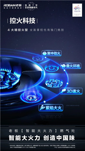 老板智能大火力燃气灶的四大精控火型既能满足日常所需,更有自己的独门绝技,让你随心创造中国味:紫焰大火行业独有,燃烧充分方能火力全开,青菜入锅10秒断生,半分钟即可出锅;3D速火立体燃烧,火力均匀渗透,实现一锅同温,造就8秒香脆的劲爽体验;叠火环喷多环同步匀火,180W防风小火不易熄灭,方便文火慢熬,煲汤好助手;聚中劲火强劲热量速达锅底,速烹百味营养不流失,快速炖煮轻松掌控。