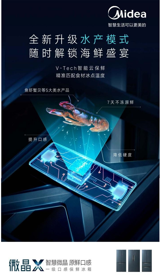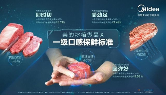 聚焦肉类保鲜难题和口感体验,美的冰箱2018年正式发布行业首创的“微晶一周鲜”技术,以“7天不冻原鲜,口感如初”颠覆肉类保鲜体验。2022年,美的冰箱微晶X上市,该产品搭载新升级的微晶一周鲜科技,新增水产模式,通过毫秒级雷达感温、V-TECH智能云保鲜、柔和环抱送风,将食材个性化智慧保鲜能力持续完善,为用户带来一级的原鲜口感。美的冰箱微晶X在口感保鲜上的极致引领,使得疫后囤货需求下的消费者,也依然能臻享原鲜如初、营养不流失的美食体验。