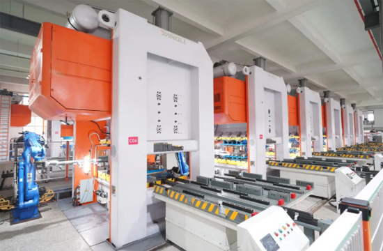 旁边是110吨八连压力机自动生产线:由八台110吨扬力液压机、9台安川机械手和一台自动上料装置构成。