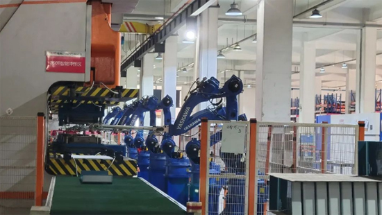 再往里走看到的是500吨液压机+250吨压力机自动生产线:由一台500吨扬力液压机、一台250吨双点扬力压力机、2台安川机械手、自动换模装置和自动上料装置构成。