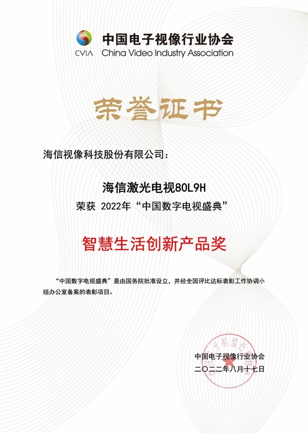 此次荣获“智慧生活创新产品奖”的激光电视80L9H是一款音画最沉浸、科技感及艺术感最强的全色激光电视,其应用创视光学引擎2.0,实现了3500:1的超高对比度,画面细节更清晰。根据中国电子技术标准化研究院的检测,L9H的蓝光安全级别为RG0(免除蓝光危害),真正实现无有害蓝光。在当今疫情常态化形势下,孩子们使用电子产品时间增加,引发了家长对孩子视力保护的担忧,因此,选择对防控儿童青少年近视有益的激光电视,也是一种积极的防控举措。