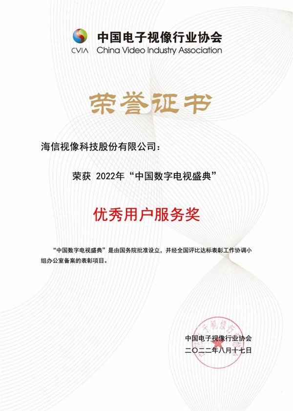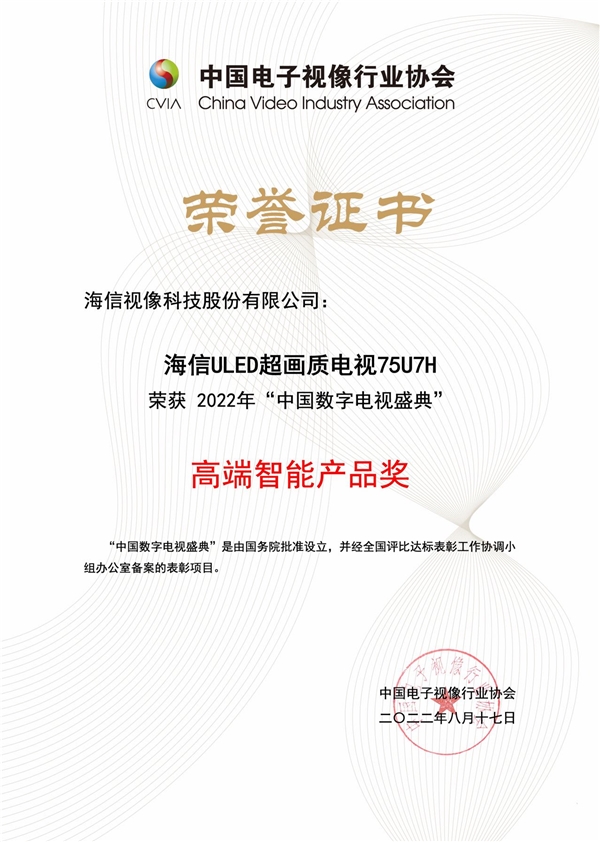 8月17日,由中国电子视像行业协会主办的“中国数字电视盛典”在深圳举行,一批引领行业发展的企业、技术和产品受到隆重表彰。海信以及ULED电视75U7H、激光电视80L9H等分别荣获了“成功品牌奖”,“智慧生活创新产品奖”、“高端智能产品奖”和“优秀用户服务奖”,成为本届“中国数字电视盛典”的最大赢家。