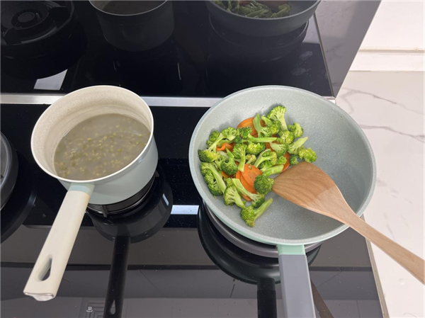 随后,在小火炖煮绿豆汤的情况下,进行了爆炒时蔬。