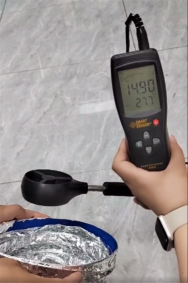 风速仪数据测量显示,爆炒档运行的时候,排烟管的排气速度已经达到14.90m/s,从数据真实反应出苏泊尔UQ77集成灶的吸力。