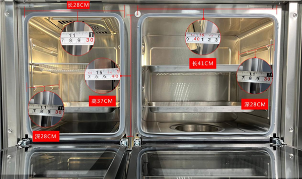 苏泊尔UQ77集成灶的左边是30L的烤箱,腔体长28cm,高37cm,拥有40-220℃热风炙烤,能够简单满足日常饮食所需。右边是40L的蒸箱,腔体长41cm,深28cm,体积更大,能够蒸制更多食物。