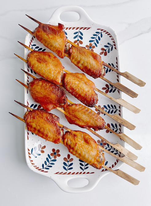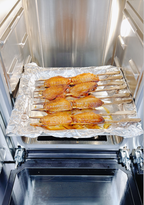 烤好的鸡翅香气四溢,色泽均匀,鸡肉外焦里嫩,撕咬时能够看到些许汁水溢出。