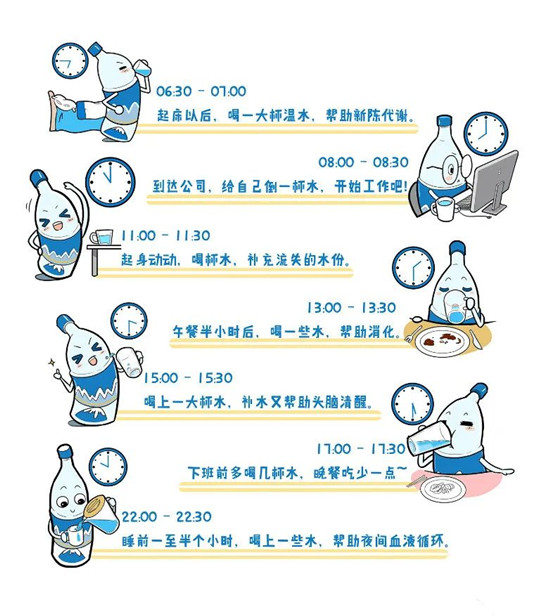 一日之计在于晨,晨起喝一杯温开水帮助身体清理肠胃,排除体内毒素;两餐之间饮水,可以加强身体的消化功能;睡觉前适量饮水,帮助机体冲淡积压液,扩张血管,有益于身体健康;剧烈活动或锻炼之后,不要立刻饮用大量的水,先缓一缓再饮水会更好。