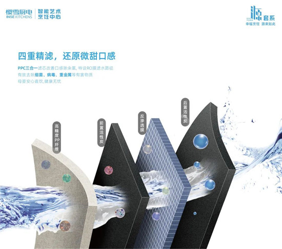 樱雪澎湃双出水2206搭载双芯四级过滤系统,PPC三合一滤芯能有效去除水中的杂质,吸附水中异色异味,改善水质,升级14页卷制RO膜,过滤精度高达0.0001微米,层层过滤,强效去除异味、余氯、细菌、抗生素等有害物质,还原微甜口感,让我们饮用的每一杯水都纯净且安全。