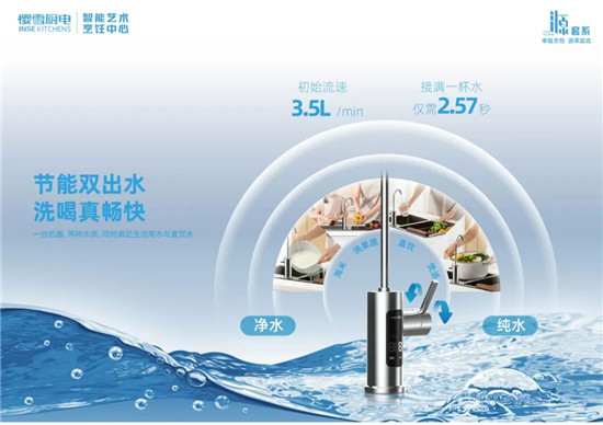 针对多数净水器产品仅能满足饮水需求,且出水量较小的痛点,樱雪澎湃双出水2206采用1200G双出水设计,3.5L/min的超大净水流量,洗果蔬/奶瓶/锅碗,宛如自来水般畅快,满足厨房洗漱用水需求!直饮用水的出水速度也完全不用担心,2.57秒就能接满一杯水,直饮/煲汤/泡茶,鲜活好水无需等待。