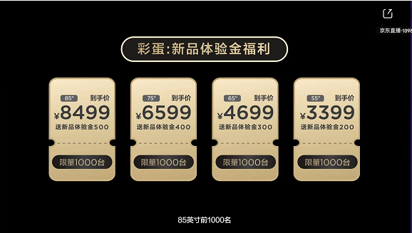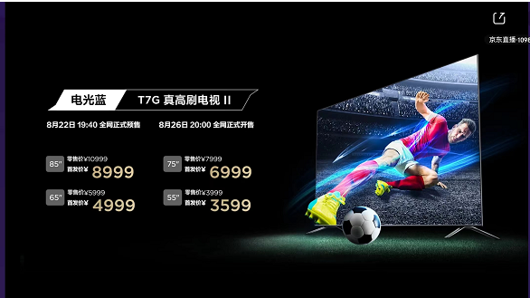 目前,TCL T7G电光蓝真高刷电视II已经开始预售,8⽉26⽇晚8点正式开售。新品首发期,每个尺寸段前1000名预定用户将赠送500元、400元、300元和200元新品体验金,最终到手价分别为8499元、6599元、4699元和3399元。