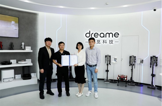TüV南德中区电子电气部销售经理陈晓艳女士(右一)、TüV南德中区电子电气部新业务发展经理朱津毅先生(右二)追觅科技中国区营销负责人郭人杰先生(左二)及追觅软件研发相关负责人参加了证书颁发仪式。