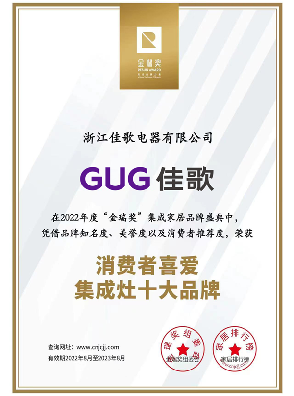在本届“金瑞奖”颁奖盛典上,佳歌集成灶荣获“2022年度消费者喜爱集成灶十大品牌”称号。