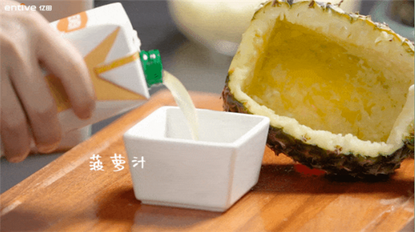 03.另取一只碗,倒入生抽、菠萝汁、料酒,用每个人独一无二的比例,调一个自己喜欢的味道。