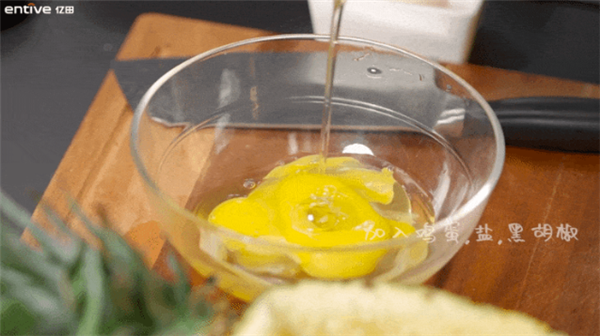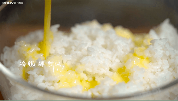02.拿一个白白净净的鸡蛋小郎君,给他磕一个脑瓜崩。然后倒入盐和黑胡椒,搅拌均匀。最后浇到“隔夜过更好吃”的冷饭上面,拿手疯狂rua rua rua!