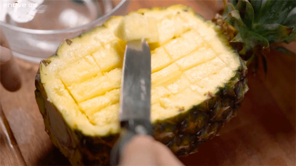 01.取一个看的顺眼的菠萝,对半切开;横竖各划出三条线,化成有爱的九宫格。然后把成丁型的菠萝肉从中取出。