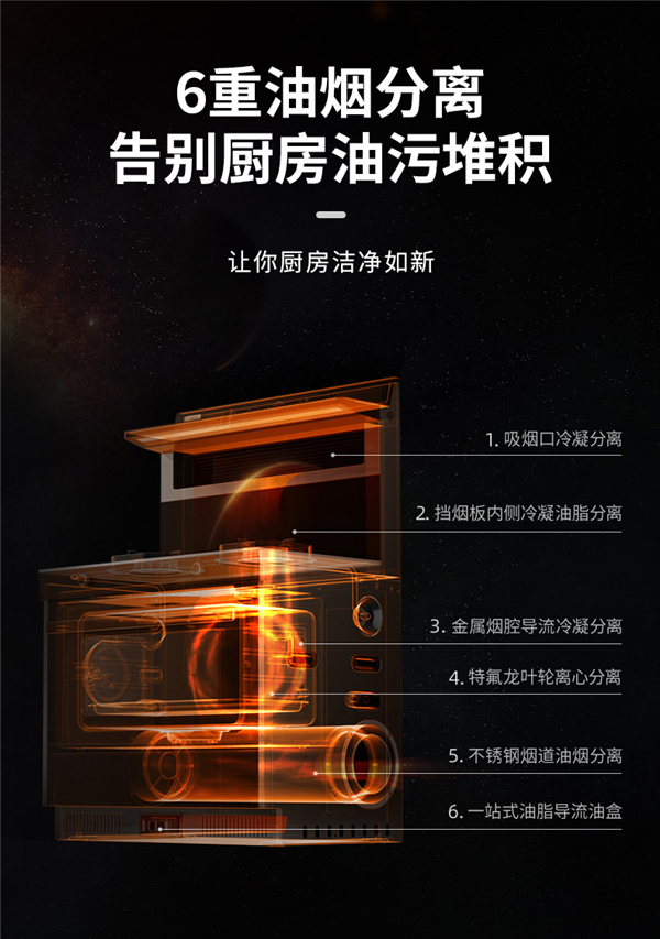 想要完美的开放式厨房,最需要解决的就是烦人的油烟困扰。亿田D6ZK蒸烤炸集成灶,延续应用“侧吸下排”、“下置风机”、15-25cm黄金控烟区低空近吸等领先科技,爆炒烹炸不留油烟。更匠心集成“吸烟腔/挡烟板/金属烟枪/特氟龙叶轮/一站式油脂导流盒/圆形不锈钢烟道”六重油烟分离技术,高效解决厨房油污堆积,让每一寸厨房都洁净如新!