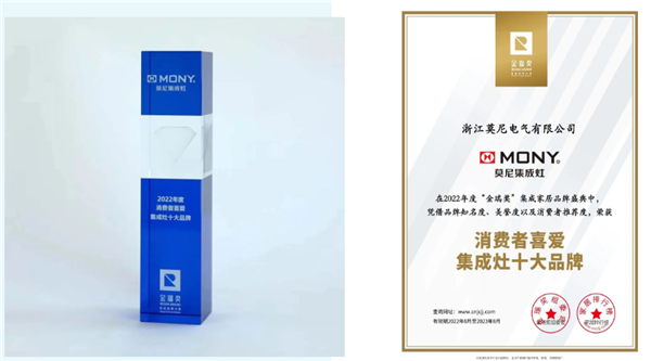 在2022品牌之夜—金瑞奖集成家居品牌颁奖盛典上,莫尼荣获“2022年度消费者喜爱集成灶十大品牌”及“2022年度集成家居数字化发展先锋品牌”两大荣誉称号。