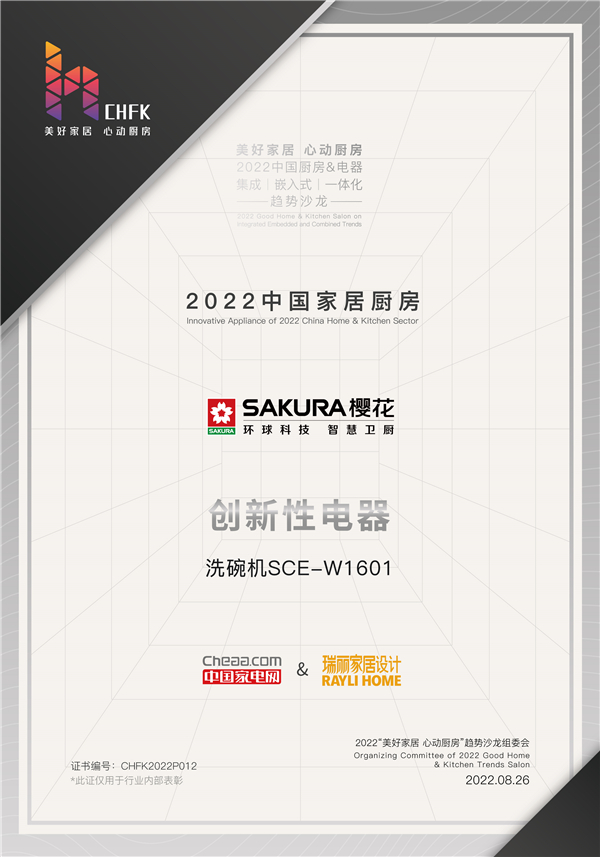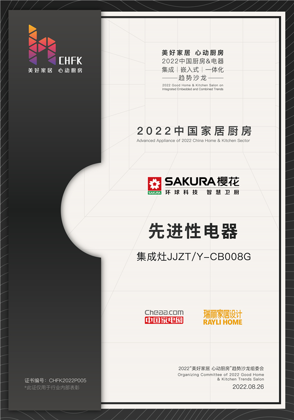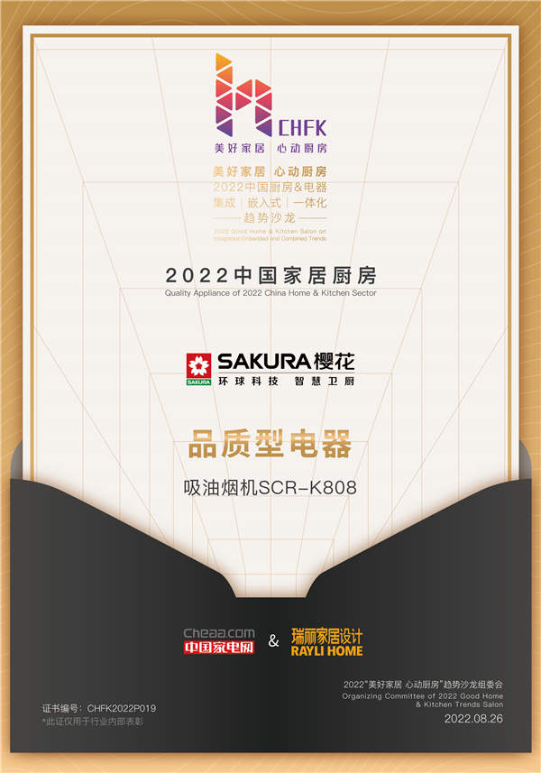 8月26日,为进一步激发市场消费潜能,推动厨电行业高质量发展,由中国家用电器协会、中国家电网、瑞丽家居联合举办,2022中国厨房&电器“集成、嵌入式、一体化”趋势沙龙,在哈尔滨举行。SAKURA樱花以出色的表现斩获三项殊荣——“2022中国家居厨房先进性电器”、“2022中国家居厨房创新性电器”、“2022中国家居厨房品质型电器”。