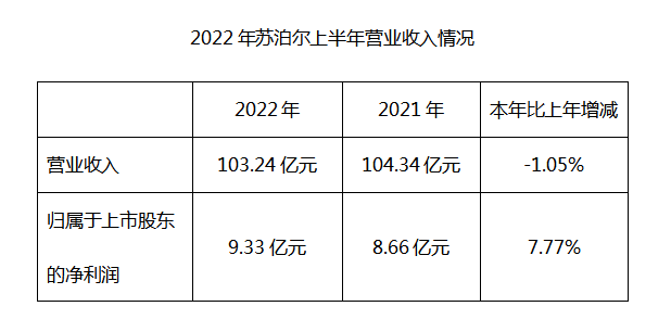 苏泊尔发布2022年中报,上半年实现营业收入103.24亿元,同比减少1.05%,实现归母净利润9.33亿元,同比增加7.77%,实现扣非归母净利润9.09亿元,同比增加5.69%,其中,2022年第二季度实现营业收入47.12亿元,同比减少11.05%,实现归母净利润3.95亿元,同比增加9.39%。