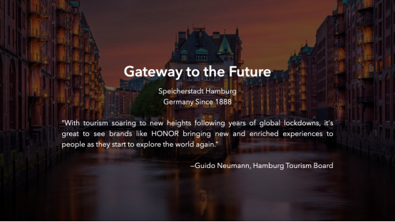 本届IFA,荣耀联合德国汉堡旅游局推出“Gateway to the Future”项目。该项目携手墨西哥艺术家Yunuen与德国艺术家Timo,应用创新的AI、AR技术,在联合国教科文组织认证的世界文化遗产德国汉堡仓库城,通过富有创造性的AR表达,让人们以数字科技的全新方式了解和欣赏文化遗产,带来沉浸式的艺术体验。