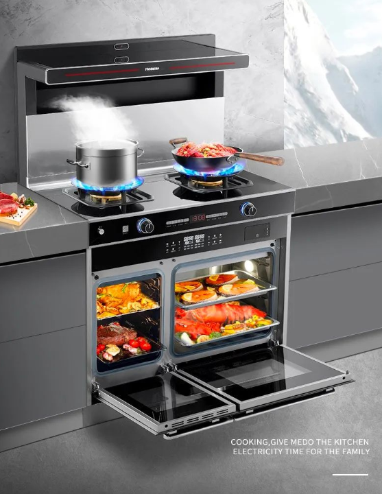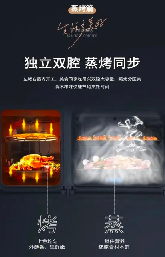 美多语音分蒸烤集成灶突破传统蒸烤一体机结构,创造性地缔造了左烤箱、右蒸箱功能,确保了蒸和烤之间不会串味,同样是高烹饪效率的体验,却可以同时get蒸和烤的乐趣。实现了边蒸边烤不串味,烹饪效率更加倍的下厨体验,产生了1+1>2的效果,让家庭烹饪更高效、节能、多样化,满足家人不同的饮食需求。