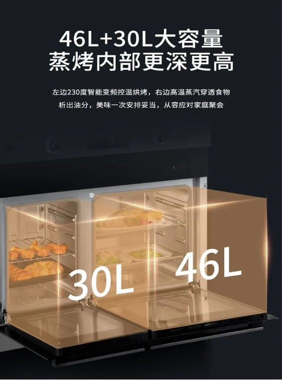 美多语音分蒸烤集成灶据黄金分割比例打造出30L左烤箱+46L右蒸箱两个独立腔体结构,大容量一次可以蒸烤多种美味,互不串味。半小时就能轻松搞定一桌菜,在家宴上皆能应对自如。