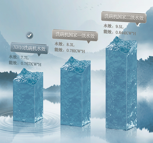 美的飞檐XH10集成洗碗机充分理解这个痛点,其水效、能效性能十分出众,各项指标均优于国家一级标准,相比二级国标,一年约可为用户节省657L水,相当于1314瓶500ml矿泉水;而能耗方面,相比于二级国标洗碗机,它一年能节省28.105度电,相当于100W的LED灯281小时的照明。以上能耗水效的计算按每天使用一次计算,如果您在家做饭频率较高,它能为您节省更多。