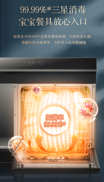 此外,通过清洗、高温烘干、长期抑菌三重优化,该洗碗机抑菌率达到99.99%。常见的金黄色葡萄球菌、大肠埃希氏菌、骨髓灰质炎病毒I型疫苗株等病菌的灭除率都到达到三星标准,为您的就餐卫生保驾护航。