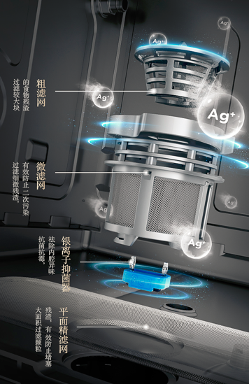 该洗碗机同时还具备银离子净味技术,在预冲洗、高温煮洗、过滤排水过程中,通过银离子抑制细菌滋及其产生的异味。