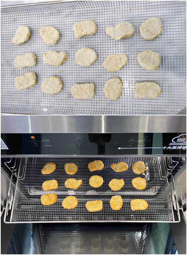将鸡块放入烤篮中,选择内置菜谱P46,15min。