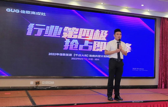 佳歌集成灶营销总经理黄成致辞并以“佳歌品牌解密”为主题进行了内容分享。黄总对佳歌集成灶品牌发展历程做了简要介绍,他重点讲解了佳歌的品牌定位和发展规划,并从产品品质、经销商利润、厂家支持力度等多个维度分享了佳歌品牌在行业中的优势地位和价值利好。