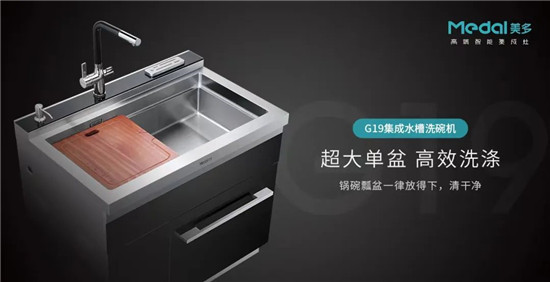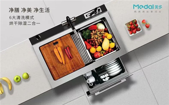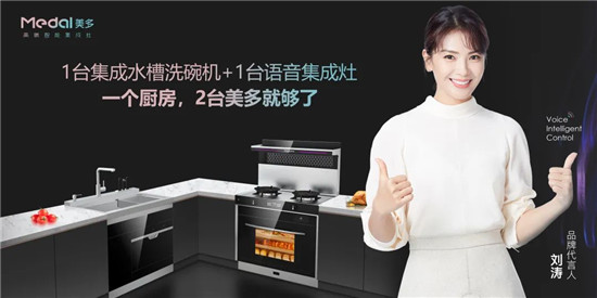 美多一站式整体厨房解决方案将厨房清洗区、准备区、烹饪区合理布局,美多语音集成灶+美多集成水槽洗碗机以小体积释放大能量,省力又高效。