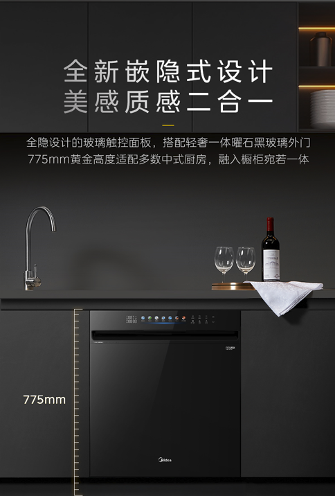 美的万向洗碗机WX3000采用全新嵌入式设计,全隐设计玻璃触控面板,将界面功能全隐藏,触控面板搭载灵动呼吸交互,清洗可见的智能洗、节能洗、标准洗等多种模式一键轻松触控,便捷省心。同时搭配轻奢一体曜石黑玻璃外门,775mm黄金高度轻松适配岛形、U形、L形等多种中式厨房,融入橱柜宛若一体。同时安全也更为便捷,其踢脚线与橱柜线保持齐平一致,并且自带门板,无需单独定制,既降低安全成本,又能完美融入厨居风格,提升厨居质感生活。