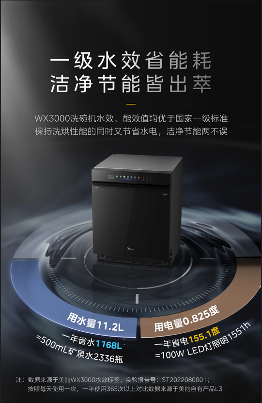 相比传统洗碗机,美的万向洗碗机WX300水效、能效值均优于国家一级标准,据实验测算,该洗碗机一年可省水1168L,一年省电155.1度,真正做到节水节电更省钱。