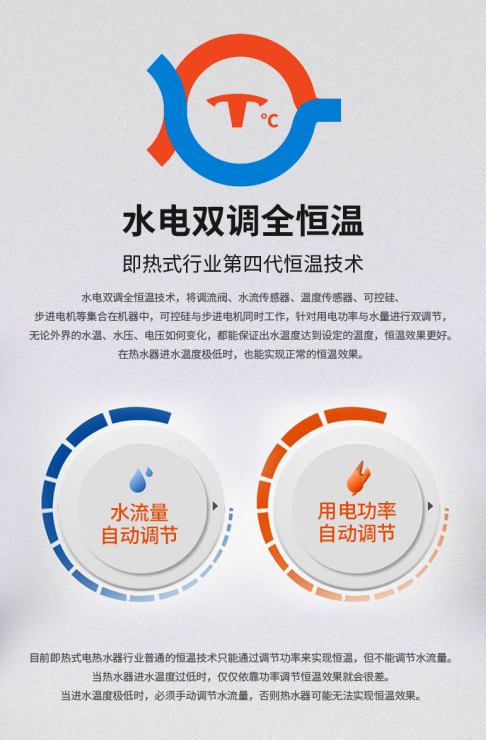 刘付志成介绍,即热式行业普通的恒温技术只能通过调节功率来实现恒温,但不能调节水流量。当进水温度极低时,必须手动调节水流量,否则的话热水器可能无法实现恒温效果。水电双调全恒温技术,自动调节用电功率,自动调节用水流量,无论外界的水温、水压、电压如何变化,都能保证出水温度达到设定的温度,恒温效果更好。在热水器进水温度极低时,也能实现正常的恒温效果。