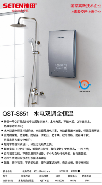 S851采用神田一号QST硅晶双芯双核6核非金属加热技术,水电分离,不结水垢,2秒出热水,热效率约98.6%;水电双调全恒温控制系统,自动调节用电功率,自动调节用水流量,恒温效果更好;超跑车的溜背式设计,尽显运动线条之美;超大宽屏LED荧光白屏,清晰明亮;触摸感应按键,操作灵敏;微电脑控制,防漏电,防超温、防超压、防干烧、故障自检、防脉冲干扰、防雷击等多重安全保护。