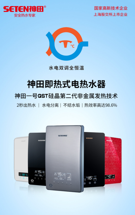 神田一号QST硅晶发热技术,水电分离,不结水垢,水质不好的地区也能使用;热启动快,2秒出热水,目前金属杯发热体、铸铝发热体很难达到这样的启动速度;硅晶发热体具有很强的导热性能,热效率高达98.6%。耐腐蚀,热稳定性好。经过二十几年的技术积累,神田在发热技术与恒温技术这两个核心技术上都遥遥领先于同行。