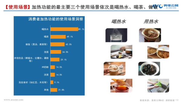 “喝热水”这一传统养生观念,随着近年来公众健康意识的持续性增强得到日益强化,净水器是否具备加热功能成为消费者购买时的重要关注点之一。加热功能,已跃升为新时代下刚需功能。《白皮书》显示,消费者加热功能的三大使用场景与需求占比分别是,喝热水89.1%,喝茶49.1%,做饭(煲汤、煮粥等)45.5%。