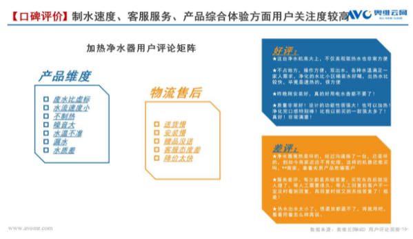 从目前行业特征来看,加热净水器的均价是非加热净水器的2.6倍。这使得消费者在选择时更加谨慎,对购买体验有更高要求。通过《白皮书》可以看出,产品功能与售后服务,是影响用户满意度的两大方面。对于产品而言,主要集中于制热慢、水流速度小、噪音大、水温不准等功能维度;而“主流”的服务痛点则聚焦在送货慢、安装慢、降价太快、服务态度差等体验维度。