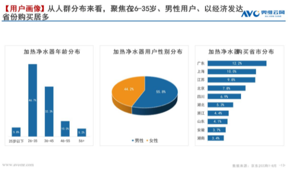男性不只是“多喝热水”理念的传播者,更是消费的主流实践者:从用户数据来看,加热净水器的购买人群聚焦在26-35岁、男性用户、经济发达省份。此外,他们对品牌、价格、促销力度更为敏感,是其购买决策时首要考虑的三大要素。