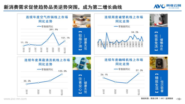 《白皮书》显示,新消费需求促使趋势品类逆势突围,成为第二增长曲线。其中,空气炸锅、破壁机、果蔬清洗机、咖啡机更是成为当代精致生活的“四标配”。